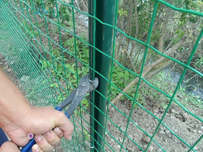 采用水泥、砂石料預(yù)埋澆筑30公分立柱,等24小時(shí)固定,再安裝網(wǎng)片,網(wǎng)片用特制工具鉗把卡扣網(wǎng)片和立柱連接在一起,因?yàn)閲W(wǎng)一卷約30米長(zhǎng),可根據(jù)地形隨意改變方向??呻S意截?cái)?,從而使安裝大大方便,即節(jié)省人力也節(jié)省了資金。