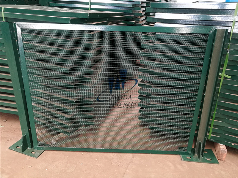 加密金屬網(wǎng)片柵欄下部封閉柔性金屬網(wǎng)采用大U型螺栓加固,并加設(shè)防盜墊圈。防護(hù)柵欄加密網(wǎng)底部應(yīng)與下欄頂面密貼,兩端部應(yīng)與立柱側(cè)面密貼,縫隙不得大于20mm。為了保證連接邊框縱橫向穩(wěn)定,長型墊圈應(yīng)焊接于邊框上,螺母錨于柵欄內(nèi)側(cè),加設(shè)防盜墊圈。