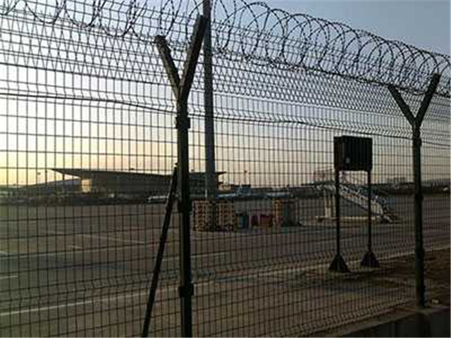 注:機(jī)場護(hù)欄網(wǎng)隔離柵頂部加設(shè)帶刺鐵絲和帶刺鋼絲繩..機(jī)場護(hù)欄網(wǎng)隔離柵。
