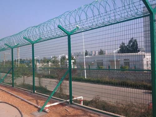 Y型立柱防護網(wǎng)由于在頂端使用V型支架而得名;近些年來通常在機場、監(jiān)獄、軍事重地等地使用,為了更好的提高防護性能,都會在網(wǎng)片中添加加強型焊接網(wǎng)片以及防盜連接裝置,V型支架則是為了放置刀片刺繩,在頂端安裝刀片刺繩可防止不法人員攀登,還可以通電防護性能更強,不過通電請作出提示,以免出現(xiàn)意外事故。