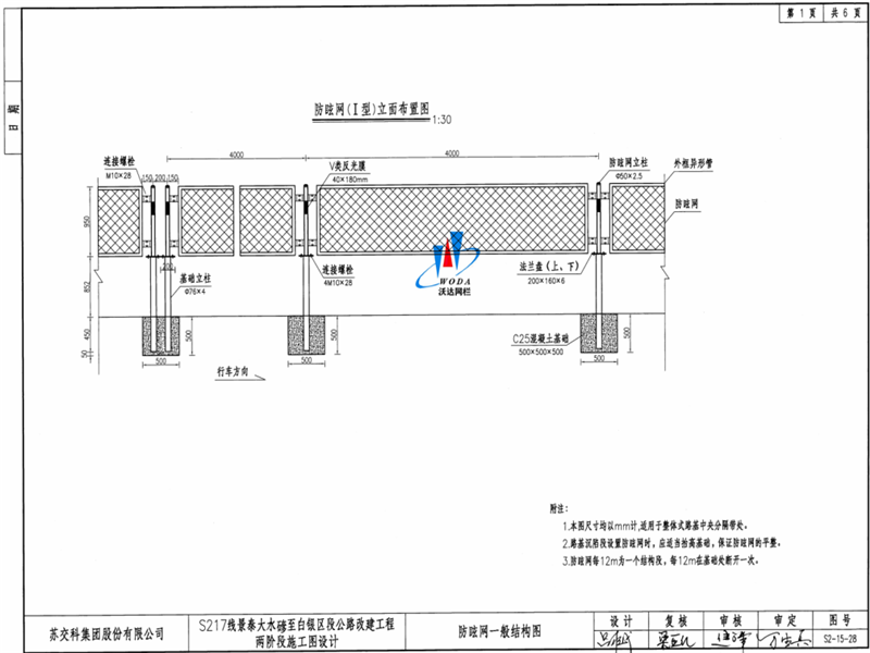 (2)防眩網(wǎng)單獨設置立柱時,可根據(jù)所在位置將立柱埋入土中、設置混凝土基礎或固定于橋梁、通道、明涵等構造物上。設置混凝土基礎,其強度達到設計強度的70%以上時,才能在立柱上安裝防眩網(wǎng)。