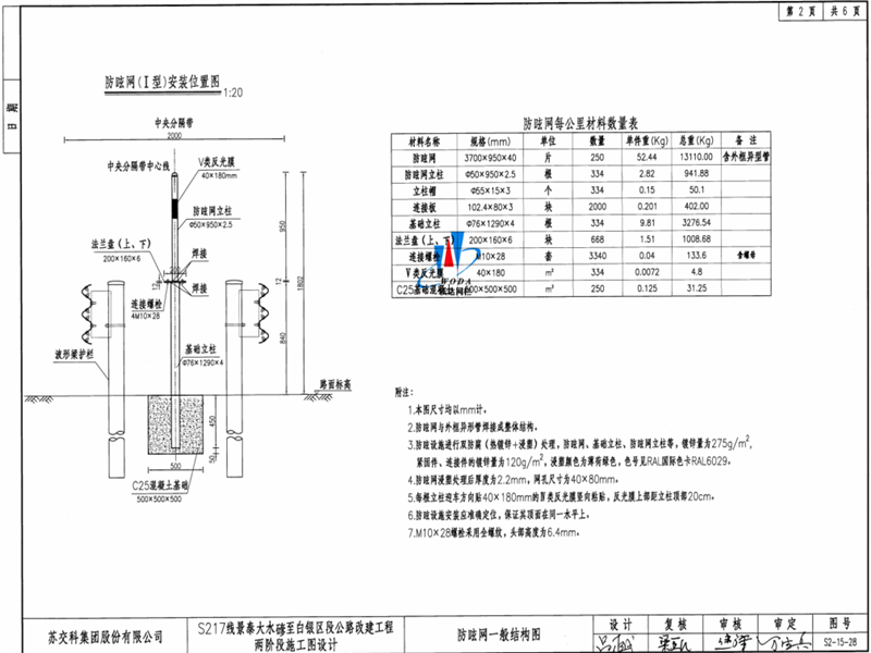 1、防眩網(wǎng)材料要求:采用鋼板網(wǎng)、異型管、邊耳、圓管焊接而成。顏色為果綠色,色號見RAL,國際色卡RAL6029,每根立柱迎車方向貼40x180mm的類黃色反光膜,豎向粘貼,反光膜上部距立柱項部20cm。