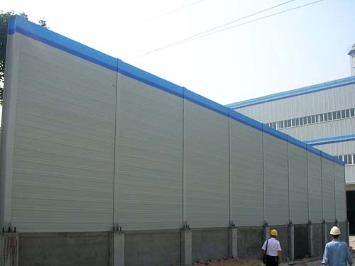 廠區(qū)隔音屏(聲屏障)主要由鋼結(jié)構(gòu)立柱和吸隔聲屏板兩部分組成,立柱是隔音墻的主要受力構(gòu)件,它通過(guò)螺栓或焊接固定在墻體或地面預(yù)埋鋼板上;吸隔聲板是主要的隔聲吸聲構(gòu)件,它通過(guò)高強(qiáng)彈簧卡子將其固定在H型立柱槽內(nèi),形成隔音墻。
